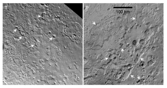 - Helfenstein, P.; Veverka, J.; McCarthy, D.; Lee, P.; Hillier, J. Large Quasi-Circular Features Beneath Frost on Triton. Science 1992, 225, 824–826. [Google Scholar] [CrossRef]