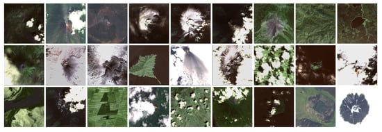 Since no ready-to-use data were found to perfectly fit the specific task of this work, a specific dataset was built by using an online catalog of volcanic events including geolocalization information []. Satellite images acquired for the place and the date of interest were collected and labeled using the open-access Python tool presented in [].