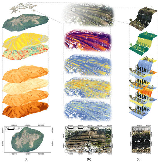 However, an integrated interdisciplinary approach for comprehensive land knowledge recovery, i.e., a holistic understanding of the dynamic interactions of terraced vineyards with their environments, is currently lacking. This type of research entails coordinated multi-modal data acquisition, integration and analysis across multiple scales from the territorial scale to the scale of an individual vineyard to individual features, such as dry-stone walls, plants or green borders of vineyards, as shown in Figure 1.