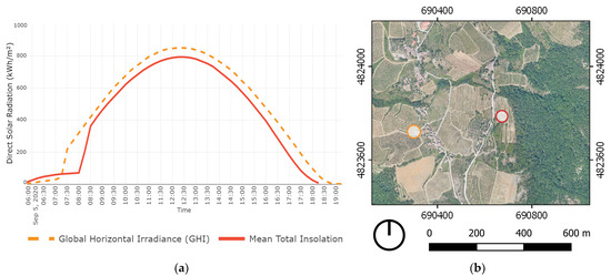 (a) Graph illustrating the comparison between the outcomes of the SAGA GIS potential incoming solar radiation analysis of an exposed location in Grospoli II vineyard (marked with red, continuous line) and global horizontal irradiance (GHI) measured by the local meteorological station in Lamole (marked with orange, dashed line). (b) Map illustrating the chosen location in Grospoli II vineyard (marked in red) and the exact location of the local meteorological station in Lamole (marked in orange).