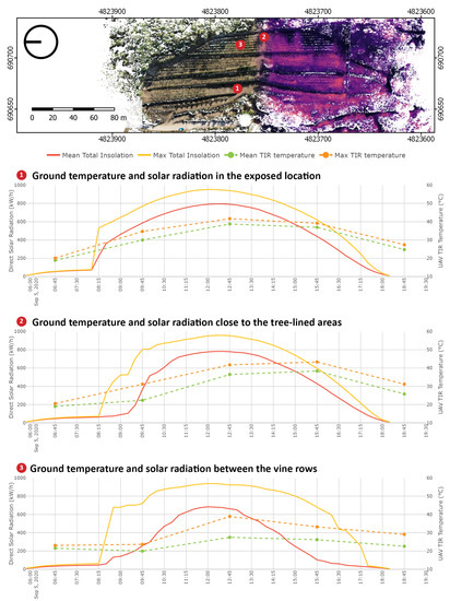 For each point in the voxel model, a neighbourhood can be selected for which the temperature and solar radiation statistics are automatically plotted as a graph. In Figure 8, three characteristic areas are presented. Those neighbourhoods have dimensions of 2 × 2 m and represent the characteristic locations in the vineyard. In the exposed location (point 1 in Figure 8), a consistent trend of temperature change is visible. This matches with the change in solar radiation with an exception from 06:00 to 08:30, where the vineyard does not receive direct sunlight. This temperature change can be explained by the growing ambient air temperature and the contribution of indirect solar radiation. In the second graph (point 2 in Figure 8), a location close to the tree-lined areas along the edge of the vineyard is presented. In the early hours, the temperature is comparably low due to the shadowing of the ground by adjacent vegetation. At 09:45, the temperature encoded in some of the voxel cells in this neighbourhood is substantially higher than the mean value. The same is true for solar radiation values, suggesting that the shadowing effect of the adjacent vegetation is gradually disappearing. Between the third and fourth acquisition, a temperature change of 2 °C is visible. However, this difference is smaller than the precision of the TIR sensor. After 12:45, the temperature drops in every other ground location; however, in this particular location, the ground temperature stays stable until at least 15:45, and in the last acquisition maximum, the ground temperature next to the adjacent vegetation is 4 °C higher than that in the fully exposed location. The third graph (point 3 in Figure 8) describes the ground between the vine rows, where the temperature does not rise beyond 40 °C. Between the first two acquisitions, no substantial temperature change can be observed, which corresponds with the low values of solar radiation. In the later hours, a significant difference between the mean and maximum values of both the temperature and solar radiation is noted due to the shadow cast by the vine plants on the ground throughout the day.