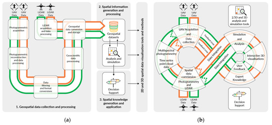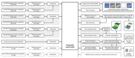 The following are available online at https://www.mdpi.com/article/10.3390/rs13173483/s1, Figure S1: Workflow diagram presenting the steps needed to construct the CVM. Left: datasets used to construct the model. Right: interfaces with external simulation tools, as well as data processing and visualisation methods. Analysis and simulation results, such as incoming solar radiation, are fed back to the CVM, thereby creating feedback loops. This is as full page version of Figure 10 presented in the article, Figure S2: Workflows for generating spatial knowledge via (a) a conventional sequential approach and (b) the proposed composite voxel model (CVM)-based approach. This is as full page version of Figure 11 presented in the article.