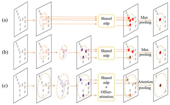 In recent years, deep-learning-based methods have achieved automatic and efficient feature extraction on point clouds with their advances in feature learning and the capacity for parameter sharing [6], which have shown extraordinary performance in various tasks such as 3D object classification [7,8,9] and segmentation [10,11,12]. Unlike the regular pixels in 2D images, 3D point clouds are composed of a series of unorganized points in a non-Euclidean space. Typical 2D convolution is unable to be directly operated on 3D point clouds due to its irregular and sparse structure [13]. To this end, PointNet [14] takes the lead work in directly processing original point clouds. It applies the Multi-Layer Perceptron (MLP) and the simple symmetric function on each point to extract global features, but it neglects to capture the local structural features to enhance the local feature representation of point clouds. The following PointNet++ [15] improved the architecture of PointNet by constructing a hierarchical neural network with a series of sampling and grouping operations on point clouds to extract both global and local features. However, whether it is PointNet++ or other later PointNet-based networks, it is noteworthy that the feature aggregation, which aims to capture the global feature on the local region, is normally implemented by the max-pooling operation as shown in Figure 1a. This only focuses on capturing the most important features among neighbors and fails to consider the other geometric local correlations between the central point and its neighbors in the local region. With the successful application of deep learning to non-Euclidean data processing, graph convolution network (GCN) [16] has attracted much more attention in recent years. Motivated by the design of the graph-based structure, Dynamic Graph CNN (DGCNN) [17] constructs a graph-like region for each point and introduces a new point convolution module dubbed EdgeConv to aggregate neighboring features in local graphs. It does this by concatenating the features of the central node with its corresponding edge features, followed by the max-pooling operation as shown in Figure 1b. Although the DGCNN realizes the utilization of the relationship between the central point and its neighbors and guarantees each corresponding neighborhood point associated with the central point, the final feature aggregation on a local graph is also achieved by a simple max-pooling operation. This aggregates the detailed information on a relatively small range of local regions, thus limiting the network to access more fine-grained local features.