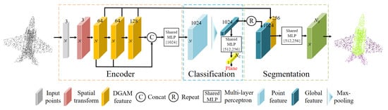 The task of the segmentation part is to segment each input point into Ns object categories at the point-level, which includes the semantic segmentation and part segmentation. The repeated global feature (N × 1024) and the three combined DGAMs feature are concatenated and then fed into two shared multilayer perceptron (MLP) layers to predict the pointwise segmentation score belonging to Ns object categories. The convolutional kernel size of the two shared MLP layers are 512 and 256, respectively, and the final segmentation result is also determined by the category with the maximal score.