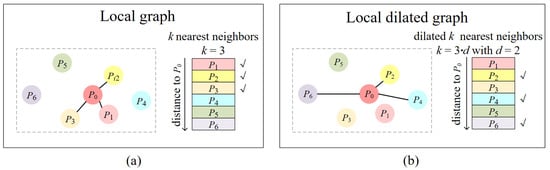 The schematic illustration of the local graph construction: (a) The construction of the local graph using normal K-NN; (b) The construction of the local graph using our dilated K-NN.