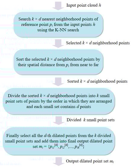 In most graph-based methods [17,31,32,33], the K-NN is often used to search for the k-nearest neighborhood points around the central point at a limited scope for the construction of the local graph. It is incapable of integrating long-range geometric correlations in a restricted space, thus limiting the geometric representation of the local points and helping the point network capture more local features. To this end, we design a dilated K-NN search based on the K-NN and explain it in Figure 5. As shown in Figure 5, suppose the input points h = {p0, p1, ..., pn} with pi ϵ RC, where n represents the number of points and C represents the feature dimension of each point. The point pi = {xi, yi, zi} is represented by its 3D coordinates, hence the C = 3. The goal is to select k dilated points mi = {pi1[d], pi2[d], …, pik[d]} in the dilated scope d to calculate the edges of the next step.