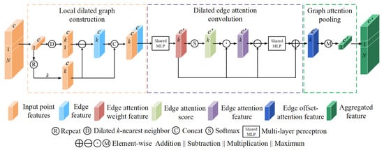 The designed DGAM is constructed to capture the local feature of the central point on the local dilated graph by attending to its neighboring points. By building the local dilated graph and embedding the offset–attention mechanism, the DGAM enables the network to establish long-range geometric correlations between each point and its neighbors and preserve more geometric information to enrich local feature representation, which is conducive to the local fine-grained feature extraction. As shown in Figure 6, each DGAM contains two shared MLP layers with output size of C’. The DGAM processes the input point feature (N × C) to generate the output aggregated feature (N × C’) through the following three major steps: the local dilated graph construction mentioned above, the dilated edge attention convolution (DEACov), and graph attention pooling (GAP).