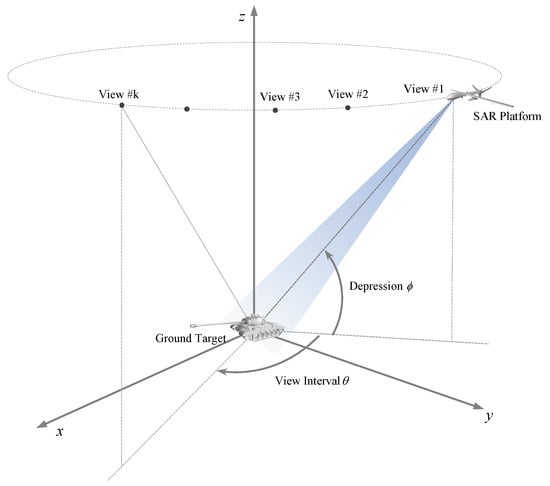 Figure 1 shows the multiview SAR ATR geometric model of a ground target. In a practical multiview SAR ATR pattern, the SAR system receives its returns and obtains multiview images of the ground target from different aspects and depressions. For simplicity, the depression is set as a constant here. When the view interval and view number k are provided, SAR can collect the ground target images in multiview imaging mode. Using these multiview SAR images, more classification information can be obtained than from the single-view pattern.