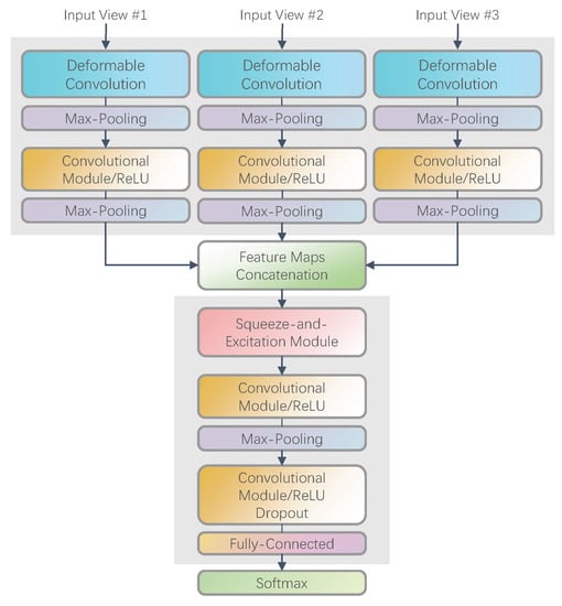 As mentioned in Section 1, the key point in multiview SAR ATR is an effective extraction and fusion classification feature. Hence, the proposed FEF-Net begins with a deformable convolutional layer in each branch to extract the inherent classification feature from each view and to accommodate the geometric variations in the SAR target. Alternate pooling and convolutional layers are present within each branch to further extract the features from each view and to reduce the feature dimensions. After the feature extraction from each view, the three branch feature maps are concatenated. These merged feature maps are linked to an SE network module to further recalibrate the feature responses and to fuse the concatenated features of the multiview SAR images together. Finally, the FEF-Net instance ends with a fully connected layer, and the softmax classifier performs the recognition decision.