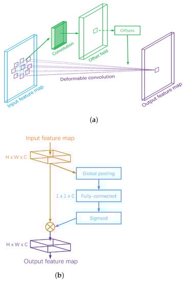 A basic architectural diagram of deformable convolution and SE. (a) Deformable convolution. (b) SE.