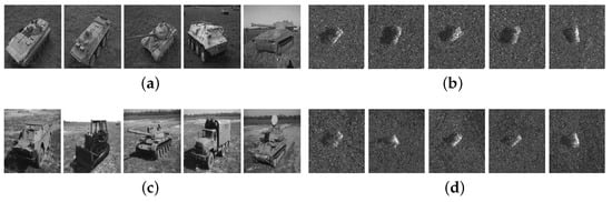 Only part of the raw SAR images were selected from these ten class targets with a depression of to generate multiview SAR image samples for training the network in this experiment. The azimuth angles of the selected images for each class all ranged . All raw images in the dataset with a depression of were used to generate testing multiview SAR images. The usage of raw SAR images is listed in Table 1. Additionally, the gray enhancement method with a power function [] was employed to enhance the scattering information of the SAR target images.