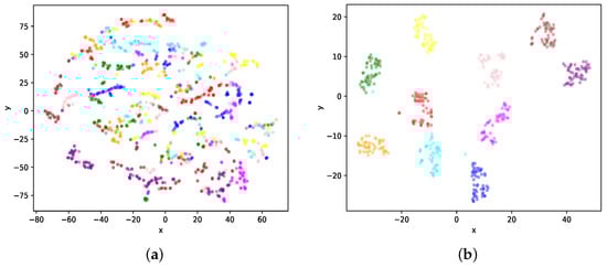 Figure 5a shows the input multiview SAR samples, and Figure 5b illustrates the corresponding outputs. We can observe that the visualization results of the original samples are mixed in Figure 5a and were difficult to classify. After being processed by FEF-Net, the samples with the same class label became closer, whereas the different class samples tended to end up far away from each other, as shown in Figure 5b. That allowed for easier classification and led to effective recognition results.