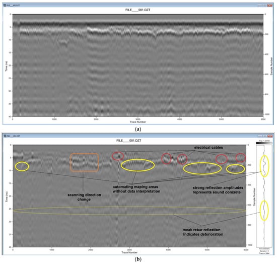 GPR waves are modified by the subsurface layer and the recorded radar data sets a contrast in electrical and magnetic properties; those changes can then be detected, represented, and characterized. A GPR data set recording delivers high-resolution information that is able to use at the interpretation and the extrapolation of information obtained with algorithms and pre-processing techniques. Figure 4 presents the scan on longitudinal directions of a zone where two urban drainage pipes with known diameter placed in a concrete duct are buried. Only one reflection peak can be seen, given by direct-coupling by the A-scan raw, which takes place when the antenna is lightly displaced from the soil [,,]. In this case, the direct waveform transmitting and receiving antenna in connected with the surface to produce a mixed waveform. A signal (A-scan) with a deep reflection to record above concrete described in Figure 4a. It can also be seen that, in the case of real data set, the signal is very noisy, including clutters []. B-scans were obtained from 55 raw A-scan types, using the specific signal processing, similar to those of ultrasound examinations, as presented in Figure 4 and Figure 5.