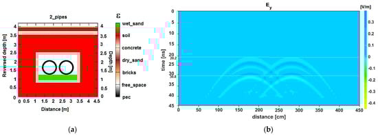 Figure 5a,b shows the presence of the two drainage pipes for hot water transportation, with an 85-cm diameter (70-cm diameter of the pipe and 15-cm protective layer), both buried in concrete duct (εs = 8) [], the top of pipes being at a 20.2-ns depth. It first uses the GPRMax software to produce GPR synthetic datasets through FTDT simulations []. The simulated data was processed with a code in Matlab 2020b (MathWorks, Inc., Natick, MA, USA). In Matlab, we used functions for removing noise by adaptive filtering, for example, “wiener2”, which filters the grayscale image using a pixel-wise adaptive low-pass Wiener filter, and a pixelwise adaptive Wiener method based on statistics estimated from a local neighborhood of each pixel. The waves penetrating the ground are propagated along the scanning line and produce EM pulses at manually chosen intervals and detect buried targets. The next reflected EM pulse can be incorporated within a radargram B-scan to produce an underground 2D image. Figure 6 presents the simulation of the experimental set-up and surveying conditions using GPRMax 2D. The layout of the survey is previewed with GPRMaxGV—Gnuplot viewer—a free plot script auto formatter developed by Goran Bekic []. The pipelines are difficult to identify in noisy profiles, which means that their GPR patterns are sensitive to noises. Introducing the raw radargrams as the test set into the simulation model, a positive section, corresponds favorable with the object locations. A reliable detection depth of GPR is determined by the central frequency of the electromagnetic wave and the attribute of the subsurface formation, while detection resolution is limited by the wave frequency and signal bandwidth [].