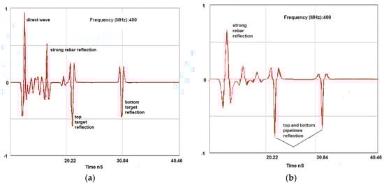 A-scan after filtering of raw experimental data delivered by GPR system: (a) original GPR record (raw data with direct wave); (b) after filtered signal (show both rebar and the pipelines reflections).