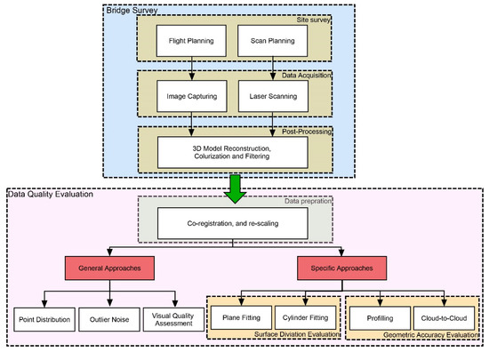 Despite the growing popularity and common application of these advanced technologies in terms of inspection and monitoring, there is still a lack of information related to the assessment of the quality and the evaluation of the occurrence of common defects for such a massive data set based on a specific standard or criteria. However, the VDI/VDE 2643 BLATT 3 guidelines [52] have been initiated to provide various approaches for the quality evaluation of measuring 3D objects in terms of accuracy and potential errors. Following this research, considering the approaches presented in the aforementioned guidelines and some general/well-known error metrics, a systematic methodology is presented. Moreover, as a real case bridge case study, the quality of the McKane Falls Bridge point clouds is evaluated and compared using the proposed approaches/methods. The methodology of this research is presented in Figure 3. This methodology would be useful for bridge surveyors to achieve a systematic and reliable methodology for data quality evaluation of the generated point clouds.