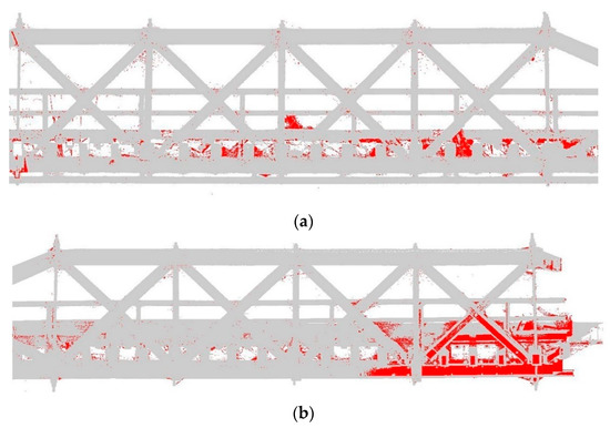 Considering the filtering method presented in Section 3.1 and Equation (9), the TLS point cloud was aligned with the UAV data using the ICP algorithm [53], and the outlier noise level for TLS data point was calculated, shown in Table 2. This calculation was conducted for three different segregations of the bridge named parts A, B, and C including parts of the timber truss and bridge deck, shown in Figure 4a. Figure 5 presents the outlier noise points in a red color after this evaluation was conducted for parts A and C. The result of this evaluation shows an average outlier noise level of 2.36% for TLS data points based on the referenced UAV data set. Although this amount of noise level is quite normal for a bridge size point cloud captured by TLS, the evaluations indicated less outlier noise for the UAV data in the case of the McKanes Falls Bridge inspection.