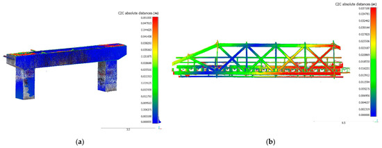 The last evaluation involved the analysis of the Cloud-to-Cloud (C2C) distances based on the local modelling strategy for two different parts of the bridge using various algorithms of LSF, triangulation, quadric surface function and nearest neighbor. The results of this evaluation are presented in Figure 8 and Table 8. In order to further clarify the results, the deviation analysis is presented based on color scales with distance values in meters from blue to red. Points with blue colors have the closest distance; however, the points with red colors are located away in both point clouds.