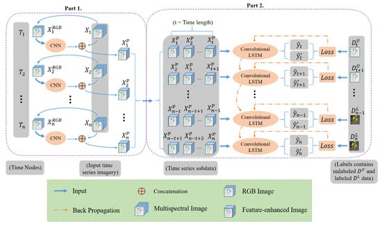 In this study, we designed a SemiLSTM for classification of long time series images. It uses a small number of labeled samples and a large number of unlabeled samples to extract the spectral, spatial, and temporal information. Figure 1 reveals the basic framework of the proposed SemiLSTM method, which can be decomposed into two parts: the pretrained model and the semi-supervised spatiotemporal modeling. In the following, we first describe how to use a trained CNN model on all images to enhance spatial features. Then, we detail how the convolutional LSTM models spatiotemporal context information and implements the semi-supervised training process.
