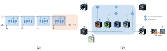 After the pretrained model, a new set of time series data is constructed from the feature-enhanced images. In order to improve the computational efficiency and training effect of the temporal model, it is divided into numerous time series subdata sets with the same time series length (t), as shown in Figure 2, like In Figure 3a, we take the sequence subdata set as an example. The self-looping structure based on recurrent neural network can be regarded as a connection with multitudinous neural units. The weights among hidden layers are shared, which makes the network have memory capabilities. There are three gate mechanisms (input gate , forget gate , and output gate that jointly control the memory of long-term and short-term knowledge of neural units. As an input is fed, a current memory cell state can be obtained by the following equation, which gathers the current input and the previous hidden state .