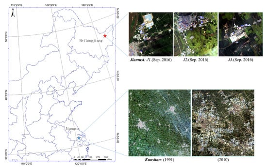 Study area locations of Jiamusi and Kunshan. We used three small areas (J1, J2, and J3) with the size of 256 × 256 pixels in Jiamusi from 2015 to 2016. The Kunshan data spans from 1991 to 2010, and the image size is 1005 × 937 pixels.