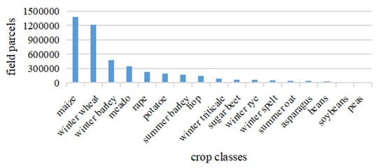 The ground truth information contains 17 crop categories, and only partial labeled samples are used. The non-uniform distribution of categories is shown in Figure 7. Similarly, we randomly selected the training and testing image blocks at a ratio of 3:1. Unlike Jiamusi and Kunshan time series data sets, its basic assumption is that the land cover has not changed. In other words, there is only one known label for Munich time series data set.