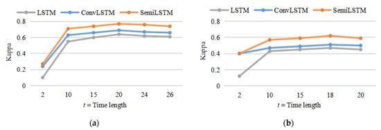 The results (Kappa) of comparative experiments with various length of time series input in Jiamusi and Kunshan data set. (a) Jiamusi time series data set; (b) Kunshan time series data set.