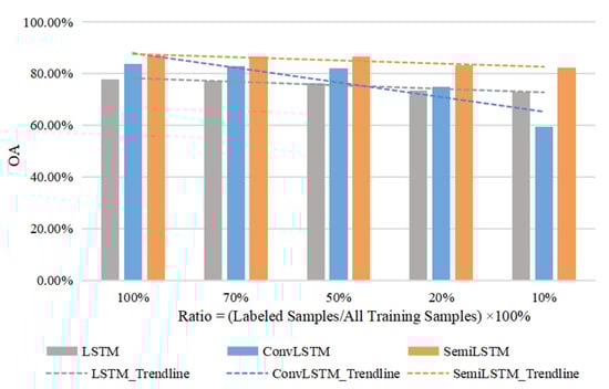 In order to explore the effect of the number of known labels on training process, five comparative experiments were set up, in which the labeled samples accounted for 100%, 70%, 50%, 20%, and 10% of the total training samples respectively. The number of known labels under different proportions were rounded down, that is the smallest integer was taken. Due to the limited length of Kunshan data and only one label in Munich, we conducted these comparative experiments in Jiamusi. Therefore, the experiments where the number of known labels account for 10%, 20%, 50%, 70%, and 100% were that only the last 2, 5, 13, 18, and 26 labeled samples were retained for training. The labels of other time nodes were filled with null values to represent unlabeled training samples, so that the total length of time series data was still 26. As described above in Section 5.1, the length of time series input t = 20. Due to the many-to-one networks, the known labels before were not used actually. When the ratios of known labels were 100%, 70%, and 50%, the classified results (OA) were similar.