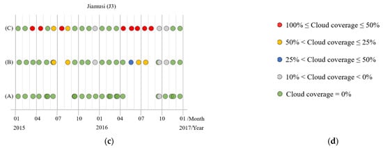The time series subdata sets with different cloud coverage in the three regions from Jiamusi, in which various colored circles represent images with varying cloud coverage. (a) J1; (b) J2; (c) J3; (d) the legend.