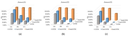 The OA results of time series subdata sets with different cloud coverage (where (A), (B) and (C) represent subdata sets containing low-cloud, less than 50%-cloud and thick cloud coverage respectively). (a) J1; (b) J2; (c) J3.