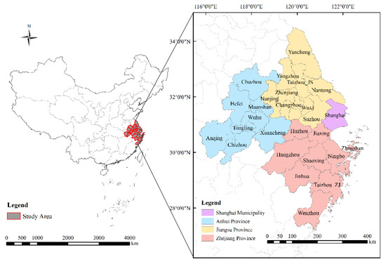 The YRDUA is located at eastern coastal China, 115°46′ E–123°25′ E, 27°03′ N–34°28′ N, with a total land area of more than 210,000 km2, and a total population of more than 150 million (Figure 1). It belongs to the humid subtropical zone, which is characterized by short cold dry winters and long hot rainy summers. The average annual temperature is approximately 13 °C–20 °C and the annual rainfall is about 1000–1400 mm. It is one of the regions with the most active economic development, the highest degree of openness, and the strongest innovation capability in China. As an important intersection of the two national strategies of the “Belt and Road” and the Yangtze River Economic Belt, it has a decisive strategic position in the overall situation of China’s modernization and the all-round opening pattern.