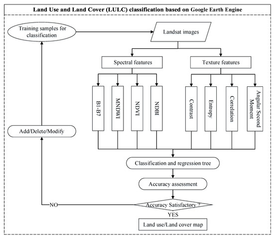 This paper carries out land use classification based on GEE platform. GEE is a free geographic computing cloud platform provided by Google, which can quickly access remote sensing images and other earth observation data in batches, and provide sufficient computing power to visually calculate and analyze the data. Many LULC mapping projects have been conducted successfully all over the world based on this platform, indicating the usefulness of GEE for extensive Earth observation [27]. The specific process is as shown in Figure 2.