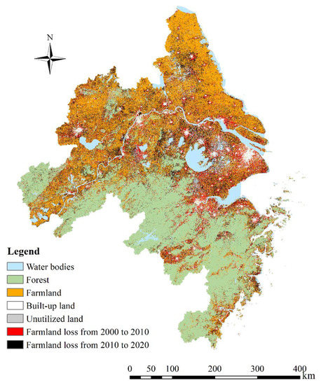 This study has found that farmland loss is a common phenomenon in most cities in YRDUA. During the period from 2000 to 2020, the farmland area in the whole urban agglomeration decreased by as much as 1.99 million ha. The results have reflected not only the most common tendencies in China, but also a global process. In southern Jiangsu Province, China, 182.485 million ha of arable land was lost to urban settlements during 1990–2006 [44]. The farmland in Changzhou, Jiangsu Province, shrank significantly and 23.79% of it was converted to non-agricultural built-up environments during the period of 2004–2011 [45]. Similar conclusions were reached in the Nile Delta, where 7.46 million ha of fertile agricultural land was lost to urban expansion from 1992 to 2015 at an average rate of 3108 ha year−1 [46], and in America, where 31 million acres of agricultural land was irreversibly lost to development [47].