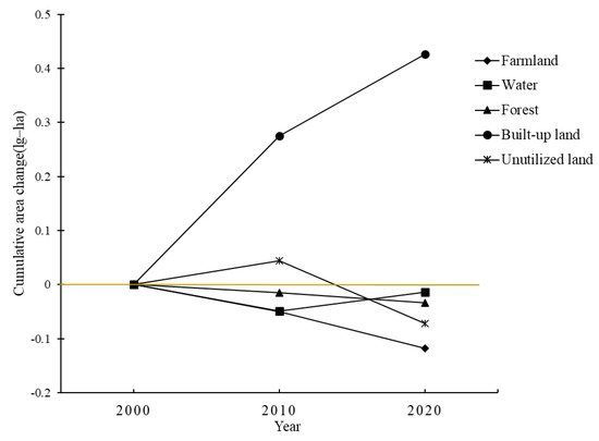 In order to better study the area, change trends of different land use types and the cumulative area changes are calculated after log-transforming the area (ha). When performing log-transformation, we select 10 as the base. Cumulative area changes were calculated by subtracting log-transformed area in the initial year from that of the target year. Compared to the land use in 2000 by 2020 the area of built-up land has increased by about 166.8% and the area of farmland has reduced by about 23.7% (Figure 5).