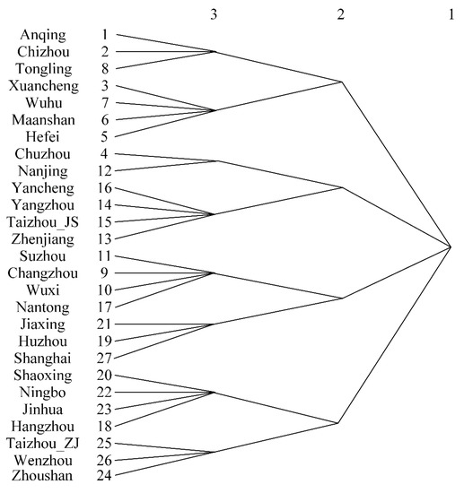 With the help of the Ucinet6.237 software, CONCOR (convergent correlation) algorithm is used to cluster 27 cities in the YRDUA. CONCOR is an iterative correlation convergence method, which is mainly based on Pearson correlation coefficient. It calculates the correlation coefficient of each row or column of the initial matrix to obtain a correlation coefficient matrix with the value between −1 and 1. The value in the matrix is related to its correlation, where −1 means completely irrelevant and 1 means completely correlated. Then the matrix is taken as the input and the correlation coefficients between the rows or columns of the matrix are calculated to get the new matrix. According to this rule, iteration continues until a correlation coefficient matrix consisting of only 1 and −1 is finally generated [37,38]. According to this matrix, cities in the YRDUA can be divided into several subgroups.