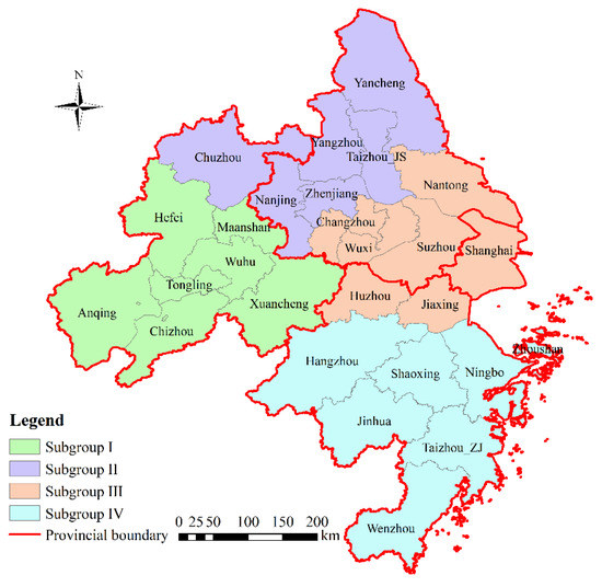 Figure 7 shows the location/division of the four subgroups. Subgroup I is in Anhui Province; subgroup II includes most cities in Jiangsu Province and Chuzhou in Anhui Province; subgroup III is composed of Shanghai, two cities in Zhejiang Province and four cities in Jiangsu Province; all the cities in Subgroup IV locate in Zhejiang Province. It shows that the division of each subgroup closely matches the geographical proximity. The formation of urban subgroups by neighboring cities is conductive to the material and economic exchange between cities.