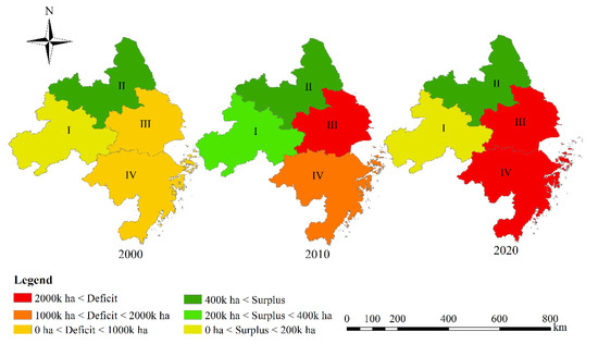 There were different degrees of farmland deficit in 2000, 2010 and 2020, which indicated that the YRDUA could not achieve food self-sufficiency since 2000. The demand for farmland resources in 2020 was far beyond the supply, resulting in a scarcity of 5.14 million ha. In terms of the surplus and deficit coefficient, the coefficient from 2000 to 2020 was negative, and the absolute value was continuously increasing, reaching a maximum of 80.36%.