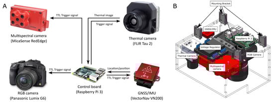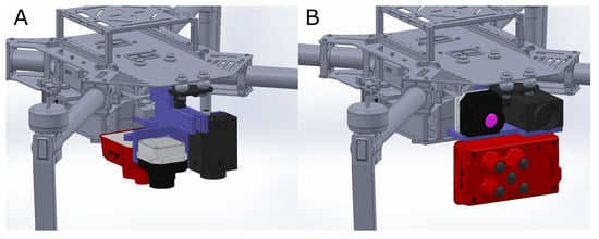 RGB, multispectral and thermal cameras mounted on a low-payload UAV (Matrice 100, DJI, China). (A) Vertical mounting. (B) Horizontal mounting.