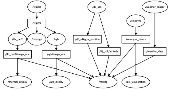 The data acquisition software was implemented by using the Robot Operating System (ROS) release indigo running on the single-board computer (Figure 5). Implemented nodes include the following: flir_tau2 (retrieves raw digital images from the thermal camera), rededge (triggers the multispectral camera), rgb (captures RGB images), and velodyne (obtains LiDAR data). All cameras are synchronized through the trigger topic. We use the ROS package dji_sdk provided by DJI to obtain UAV location and pose. The weather_sensor node is used to receive data from the sensor on the station and to publish atmospheric data as a ROS topic. Data recordings are conducted by the rosbag node. The rosbag node saves the sensor data, drone flight data, and weather data to a bag file.