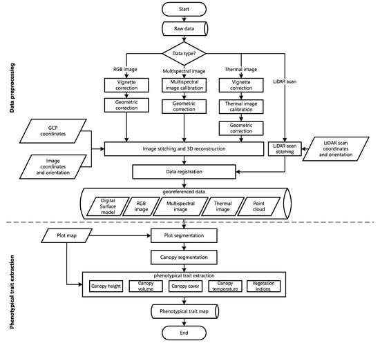 We also provided a complete data processing pipeline to calibrate multispectral and thermal images, to generate registered orthomosaics and 3D models, and to extract basic phenotypic traits. The basic phenotypic traits can be used to support the computation of more complex phenotypic traits. For example, morphological traits can be used to monitor crop growth and estimate the yield. Vegetation indices and canopy temperature can be used to evaluate the water status of plants. The data processing pipeline used to extract phenotypic traits was implemented in open-source software Python and QGIS, which allows for easy integration of other methods and data visualization. The data processing pipeline can be improved by replacing the commercial software Metashape with open-source software, such as OpenSfM (www.opensfm.org, accessed on 1 March 2021), to render it more streamlined.