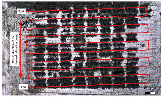 During the data collection flight, the air temperature and humidity varied from °C to °C and from 35.7% to 40.5%, respectively (Figure 15). Conditions resulted in high transmittance of the atmosphere (, ) and resulted in little impact of upwelling atmosphere radiation on thermal images. After image calibration, temperatures of the two calibration targets derived from thermal images were highly correlated with temperatures measured by the RTD sensor, and pre-calibration MAE ( °C) was significantly reduced to °C (Figure 16).