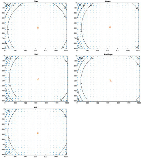 Vignetting correction was performed using the vignetting model obtained from the vignetting calibration. The corrected image intensity () is calculated using Equation (5) from the original image intensity (I), the sensor black-level (BL), and the vignetting correction factor (V) [37]. For the multispectral image, the vignetting correction is integrated as a part of the radiometric calibration.