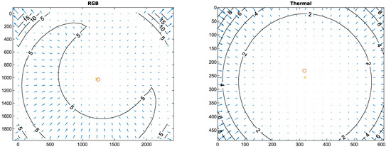 In order to calculate model parameters, we measured the vignetting effect by imaging a scene with uniform luminance. For the multispectral camera, we used an integrating sphere to create such a scene. The setup of the integrating sphere is similar to [38], but we added a Teflon sheet to cover the exit port so the light could be more evenly distributed after passing the Teflon sheet. A black body was used for the same purpose for the thermal camera. We collected ten images for each camera and used the mean image to find the model parameters. The parameters (, and to ) were estimated using least squares fitting. The value of for fitting the model is the raw pixel intensity subtracting the black level and normalized against the pixel intensity at the center of vignetting.