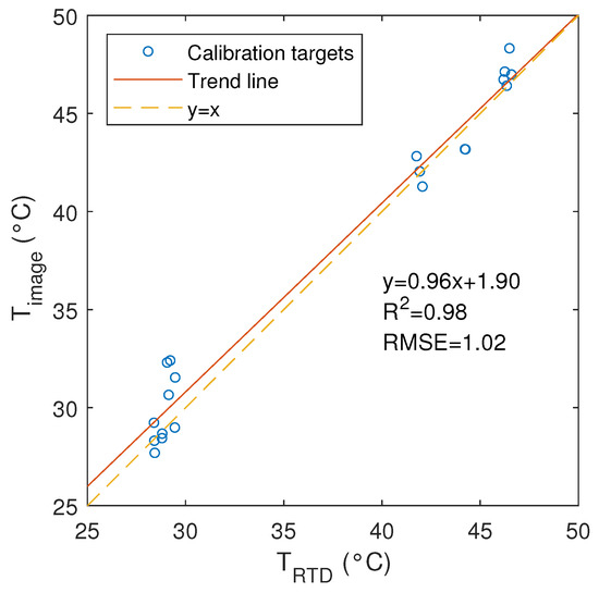 Correlation between image-derived temperatures () and temperatures measured by the RTD () for the thermal calibration targets.