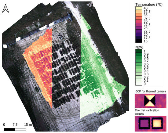 Overlay of UAV-derived orthomosaics, including RGB (background), temperature (section of mosaic; light yellow to black), and NDVI (section of mosaic; light green to dark green). Zoom-in images showing calibration targets, and the GCPs for the thermal camera are also displayed (bottom right).
