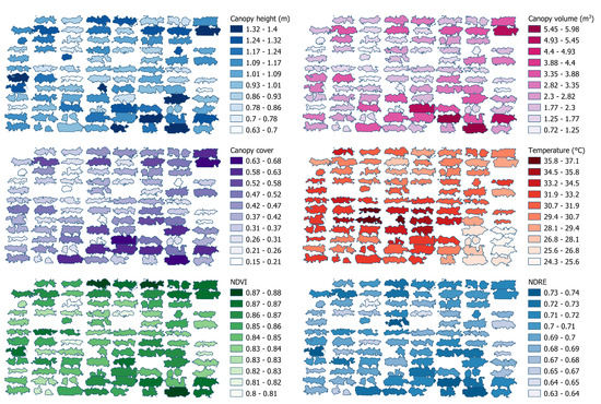 Multiple phenotypic traits can be extracted from data captured by the integrated cameras and LiDAR sensor. Basic traits can be extracted directly following data preprocessing, including vegetation indices (VI) derived from multispectral images and canopy temperature (CT) derived from thermal images, as well as morphological traits such as canopy height (CH), canopy cover (CC), and canopy volume (CV). More complex traits, such as biomass and water stress, are out of the scope of this paper but can be obtained from the basic traits using regression models [12,21]. A program was created to extract phenotypic traits automatically by using QGIS 3.10 and Python 3. The extracted traits were saved to a csv file and visualized in QGIS.