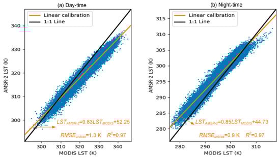 The PM BTs at 18.7 GHz and 23.8 GHz have a theoretical temperature sensing depth of around 1 cm [], as compared to the MODIS LWIR-derived LST skin surface depth of ≤1 mm []. To deal with this we first averaged the MODIS 1-km LST data of Kenya to the 25-km EASE Grid and compared those cells that have more than 600 samples (i.e., >95%) of clear-sky MODIS pixels to the AMSR-2 retrieved LST for the same region. As seen in Figure 3, both daytime (ascending) and night-time (descending) MODIS and AMSR-2 LSTs show strong correlations but depart from the 1:1 line. This result agrees with the observations of Song et al. [], who demonstrated that, apart from in desert and snow/ice covered areas, the LST derived from these two different sensors have a strong linear correlation at the global scale. The AMSR-2 observations have a negative bias of around −0.7 K in the daytime and a positive bias of around 2.5 K in the night-time. This is consistent with the logic that compared to temperature of sub-surface soils, that of skin surface is usually higher at mid-noon but lower at midnight. Therefore, the bias in Figure 3 can be largely ascribed to the different sensing depths. To enable the AMSR-2 LST data to provide the best estimate of what MODIS would have measured, we fit an independent linear equation to the data of day-time and night-time modes respectively, as shown by the orange text in Figure 3. These achieved high coefficients of determination (R2 ≥ 0.9), with RMSEs between the AMSR-2 LST data adjusted via these equations and the true MODIS LST (RMSEunbias) of less than 1.5 K. The small value of RMSEunbias proves a high degree of consistency between PM (AMSR-2)-derived LST and MODIS LWIR LST, thereby confirming the feasibility of the penetration depth bias adjustment process.