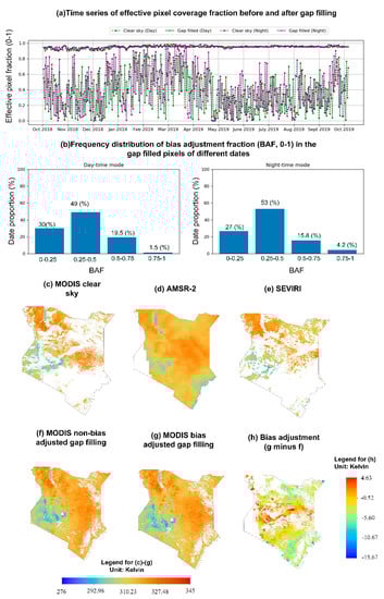 Demonstration of the cloud gap filling approach for the Aqua MODIS LST data record. (a) Time series of LST fractional coverage of Kenya before and after gap-filling. (b) Proportional distribution of bias adjustment fraction (0–1) in the gap filled pixels of different dates. (c–e) Daytime LST maps from the different spaceborne sensors recoded near simultaneously on 22 October 2018, and (f,g) the MODIS LST data of (c) now cloud gap-filled using the methodology detailed herein. All MODIS LST pixels with an NDVI of <−0.2 (indicating the likely presence of surface water) have been screened out in these latter two datasets. (h) A bias adjustment map of cloud gap-filled LST (clear sky pixels eliminated) generated by (g) minus (f).