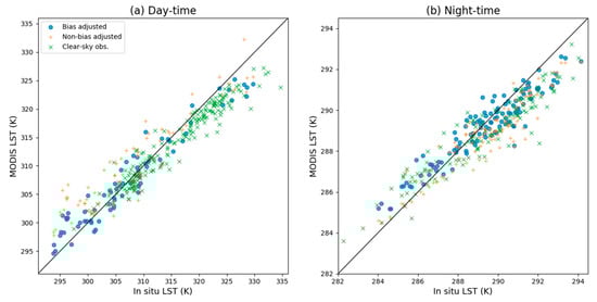 It is noticeable that we find a relatively inconsequential cloud insulation effect on LST bias correction at night (Figure 12b), as opposed to the effect seen in the morning-to-noon window. The difference between daytime and night-time observations has rarely been discussed in previous studies related to cloud gap-filling of an LWIR-derived LST dataset, with some authors ignoring the problem by only tackling night-time cloud gap-filling []. Other works may have failed to find significant day/night differences, because they calibrated against air temperatures rather than the more physically accurate surface temperatures [,]. Our findings suggest that the difference between bias-adjusted and non-bias adjusted gap-filled LST, driven by cloud insulation, is less sensitive to ground long-wave outgoing radiation and downwelling atmospheric radiation at night, as compared with the shadowing of solar short-wave incoming radiation during the day.