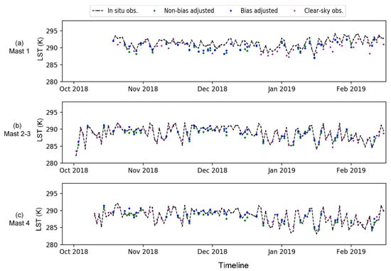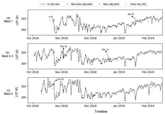 Time series of MODIS cloud gap filled daytime LSTs and corresponding in situ LSTs recorded at the locations of (a) Mast 1, (b) Masts 2 and 3 (averaged), and (c) Mast 4 of the ILRI Kapiti Research Station. Note that cloud gap filled LSTs are only shown when both Step 1 and Step 2 of the cloud gap-filling methodology were applied as detailed in Section 3 (“non-bias adjusted” and “bias adjusted” respectively). Dates marked by the box and arrows are those examined in Section 4.4.